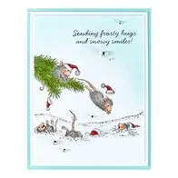 Das Stempelset „Snowy Smiles Cling Rubber Stamp Set“ ist Teil der „House-Mouse Tree-mendous Christmas Collection“. Monica, Maxwell, Friend, Muzzy und Amanda haben jede Menge Spaß im Schnee und tauchen mit einem Ast in die Schneewehen ein. Zusätzlich zum Hauptmotiv enthält das Set aus vier Stempeln drei Sprüche: „Sending Frosty Hugs and Snowy Smiles!“, „Snow Many Reasons to Smile This Season!“ und „Enjoy the Season!“. Zur Verwendung mit einem Acrylstempelblock. Die House-Mouse Designs® wurden von der talentierten Ellen Jareckie entworfen und sind urheberrechtlich geschützt. Es ist eine wunderbare Zusammenarbeit mit Spellbinders, und wir freuen uns, Ihnen mit der Tree-mendous Christmas Collection eine warme und gemütliche Weihnachtsdesignserie präsentieren zu können!