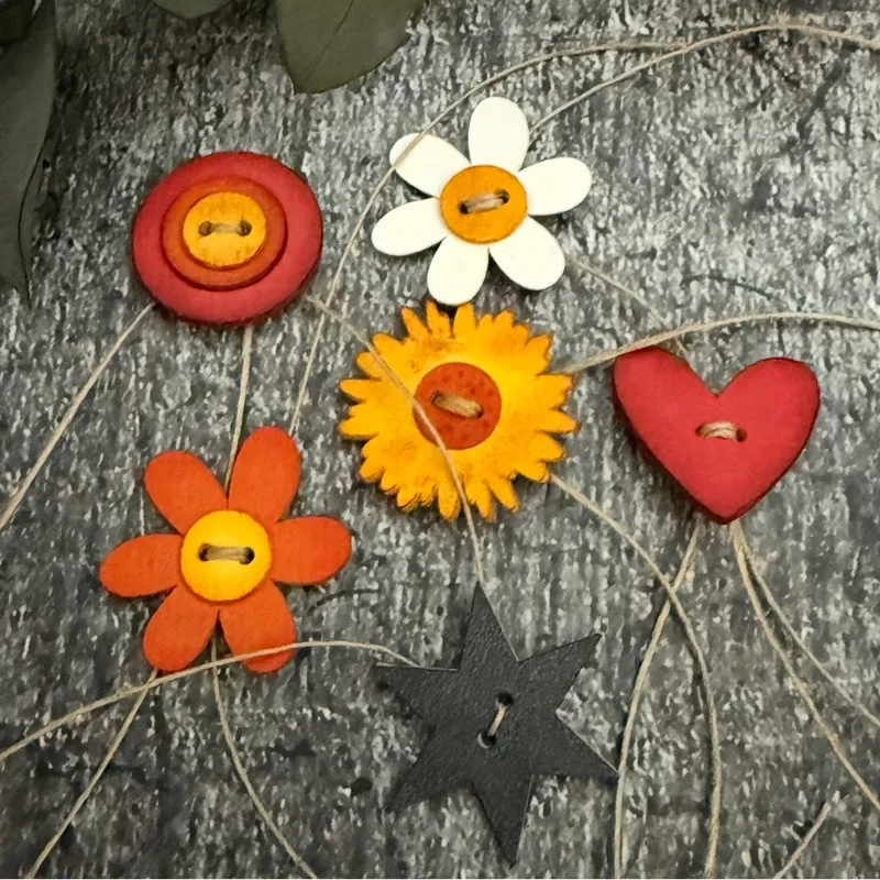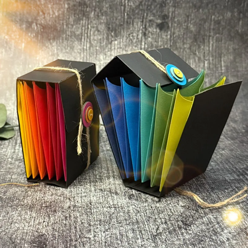 Wir haben mehrere Verschlussmöglichkeiten in Form von Knöpfen, in diese Stanze integriert, ihr stanzt die Knopfformen einfach 3-4x aus dickerem Papier und klebt sie aufeinander, als oberste Schicht klebt ihr euer Wunschpapier und habt so die genau passenden Knöpfe! Durch die verschiedenen Größen könnt ihr sie farblich kombinieren und aufeinander stapeln.