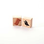 Für eine gute Handhabung der Stempel wird das Stempelgummi mit einer dämpfenden Schicht auf einen Griff geklebt. Dieser Griff besteht aus einem lackierten Buchenholzklötzchen, das das Motiv in original Größe zeigt.