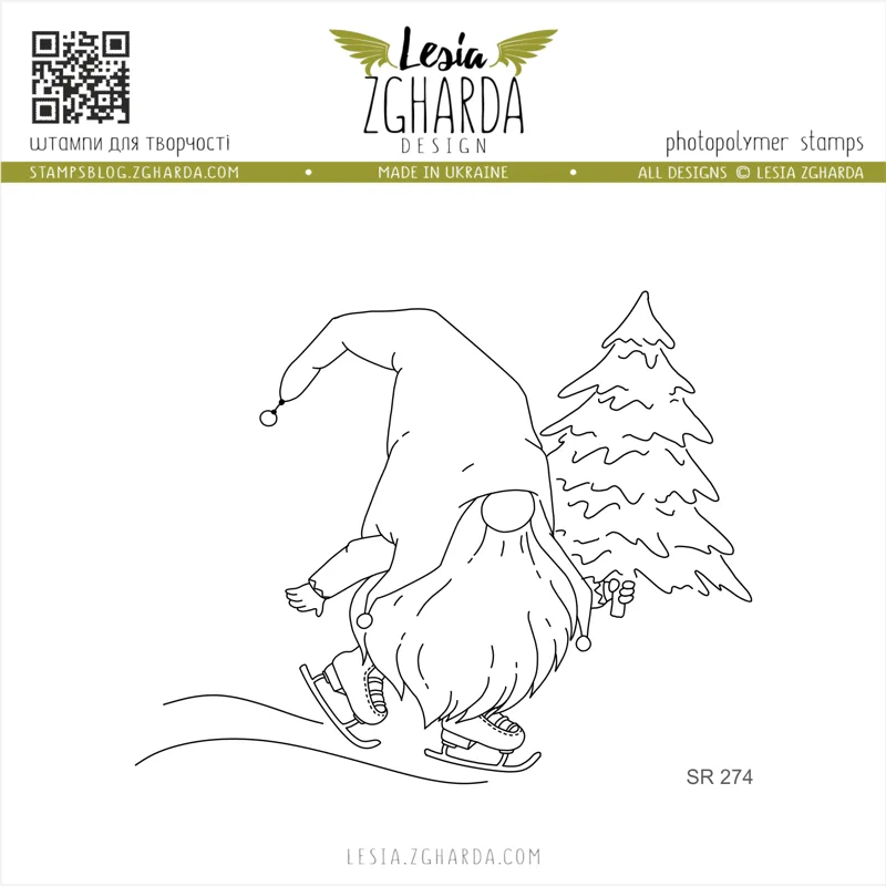 Lesia Zgharda Stamps "Gnome Skating with Christmas Tree"