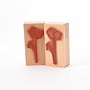 Für eine gute Handhabung der Stempel wird das Stempelgummi mit einer dämpfenden Schicht auf einen Griff geklebt. Dieser Griff besteht aus einem lackierten Buchenholzklötzchen, das das Motiv in original Größe zeigt.