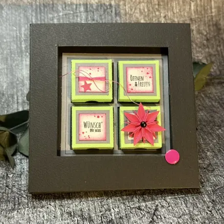 Kleine Miniboxen, verbunden mit zwei verschiedenen Rastern und kleinen Zusatzstanzen. Die kleinen Boxen dienen zum Aufkleben auf Karten oder Geschenken, um z.B. ein Geldgeschenk darin verschwinden zu lassen.